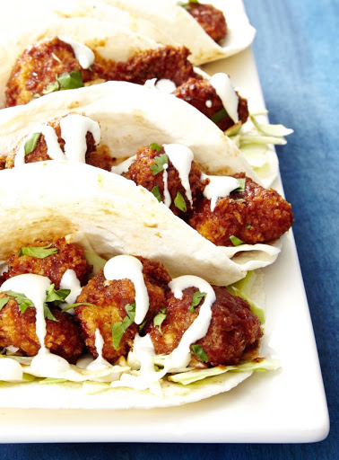 Serve chicken in tortillas with cabbage and drizzled with ranch. Garnish with cilantro.