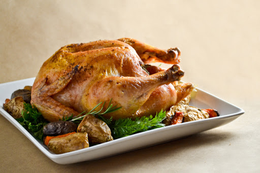 Roast for 1½ to 2 hours, depending on size (plan on about 20 minutes per pound). If chicken is browning too quickly, cover loosely with aluminum foil. To measure temperature, place a meat thermometer into the thickest part of the thigh without touching the bone. It should reach 180ºF.