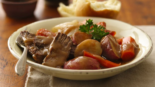 Add potatoes, carrots and onions to Dutch oven. Cover and simmer about 1 hour or until beef and vegetables are tender.