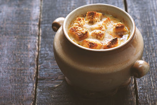 Remove lid from slow cooker and sprinkle croutons across the surface of the soup. Add sliced gruyere cheese, place lid back on slow cooker and cook for another 15 minutes or until cheese is melted.
