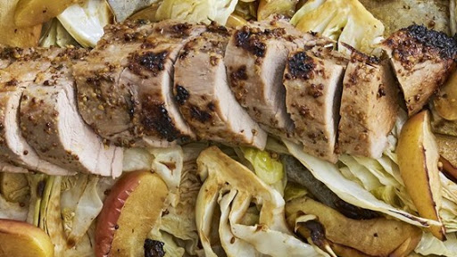Pat pork dry and season with remaining teaspoon salt and 1/4 teaspoon pepper. Whisk together remaining 2 tablespoons oil with mustard, vinegar, honey, and thyme in a small bowl. Spread over all sides of pork and set pork on top of cabbage and apples.