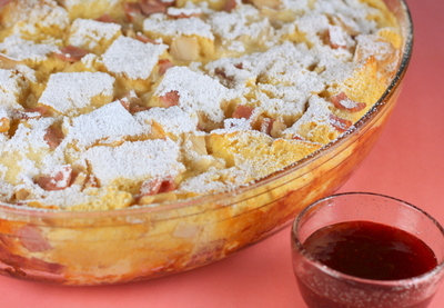 As soon as you remove the casserole from the oven, sprinkle a generous layer of powdered sugar through a sieve evenly over the top of the casserole. Serve warm with strawberry jam to spoon over each serving.