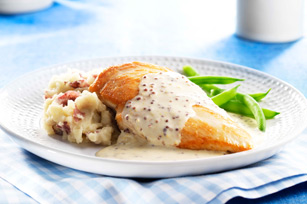 Add cream cheese spread to skillet; cook on medium heat 5 min. or until melted, stirring constantly. Whisk in broth and mustard; cook and stir 2 to 3 min. or until sauce is thickened and well blended. Pour over chicken