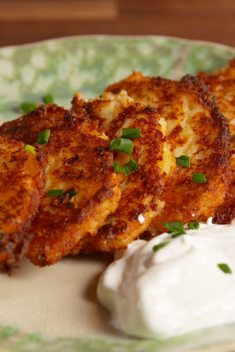 In a large bowl, combine potatoes, cheese, chives, hot sauce, salt, and egg. Form into half dollar-sized dough balls, and drop by the spoonful into the warmed skillet. [Note: If your mashed potatoes are a little runny, add a 1 tbsp. of flour at a time until you can form dough balls]