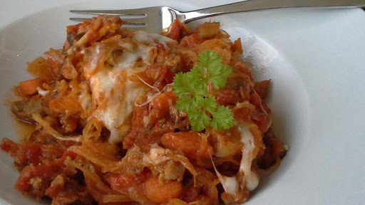 Use a fork to scrape insides of squash into spaghetti strands. Transfer strands to a 9x13-inch casserole dish. Spoon sauce over strands and stir to combine. Cover with mozzarella cheese.