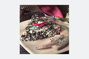 Cut into wedges. Garnish each serving with red pepper slivers.