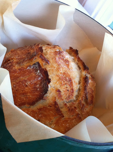 3. About 30 minutes before baking, adjust oven rack to lowest position, place 6- to 8-quart heavy-bottomed Dutch oven (with lid) on rack, and heat oven to 500 degrees. Lightly flour top of dough and, using razor blade or sharp knife, make one 6-inch-long, 1/2-inch-deep slit along top of dough. Carefully remove pot from oven and remove lid. Pick up dough by lifting parchment overhang and lower into pot (let any excess parchment hang over pot edge). Cover pot and place in oven. Reduce oven temperature to 425 degrees and bake covered for 30 minutes. Remove lid and continue to bake until loaf is deep brown and instant-read thermometer inserted into center registers 210 degrees, 20 to 30 minutes longer. Carefully remove bread from pot; transfer to wire rack and cool to room temperature, about 2 hours.