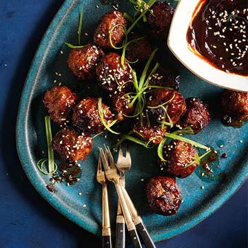 Return meatballs to skillet. Simmer in sauce for 5 minutes. Transfer to a serving bowl and, if using, scatter sesame seeds and scallions on top. Serve with toothpicks or cocktail forks.