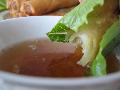 1) In a small sealable jar, combine water and sugar and stir to dissolve the sugar. Add fish sauce, vinegar and lime juice and mix. Adjust flavors to taste.