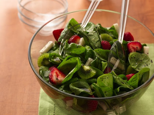 In a large salad bowl, place the spinach, strawberries, jicama sticks and kiwifruit slices. Shake the dressing again to mix ingredients. Pour the dressing over the salad ingredients, and toss with 2 large spoons or salad tongs. To keep salad crisp, serve immediately.