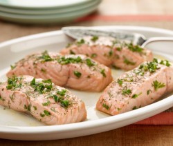 The definition of simple: fresh, skin-on salmon fillets, given a quick marinade with parsley, lemon, and olive oil, then seared to produce crisp skin and moist flesh. A quick pan sauce of shallot, garlic, white wine, butter, and capers finishes it off. Serve with rice pilaf. If you prefer to avoid wine, use water instead.