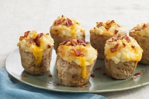 REDUCE oven temperature to 350ºF. Cut small slice off both ends of each potato. Cut potatoes crosswise in half; scoop out centres into medium bowl, leaving 1/8-inch-thick shells. Mash potato flesh. Squeeze head of garlic to remove roasted cloves. Add to potato flesh with sour cream, 1-1/4 cups Cheddar and Parmesan; beat until fluffy. Spoon into shells, mounding as necessary to fit; place in shallow baking dish.