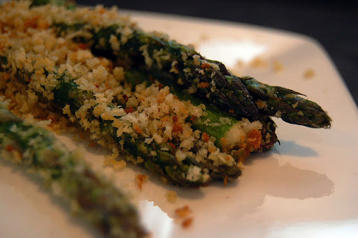 Set up a breading station by whipping the egg whites and mayonnaise together (the mayonnaise helps the whites stick to the asparagus). Sprinkle with some salt and pepper.