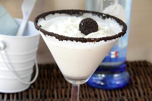 Dip rim of glass in syrup, then dip rim in oreo crumbs. Strain drink into glass.