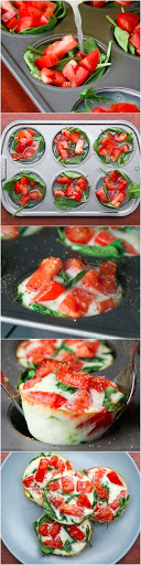 2. Lightly grease a muffin tin, then divide equally the spinach, tomatoes, and egg whites across 6 cups. Season with salt and pepper.