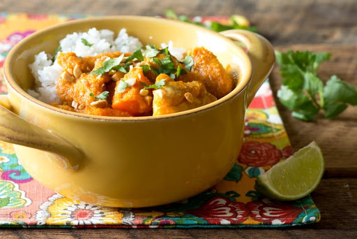 Healthy Coconut Chicken & Sweet Potato Stew satisfies after a long and busy day. The creaminess comes from coconut milk. With a ginger and jalapeño kick.