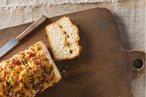 Place half the biscuit pieces in 8x4-inch loaf pan sprayed with cooking spray; top with half each of the cheese, bacon and onions. Repeat layers.