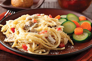 Heat oven to 350°F. Drain spaghetti; return to saucepan. Add cream cheese sauce, chicken mixture and 2 Tbsp. Parmesan; mix lightly. Spoon into 2-L casserole dish; cover.