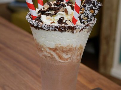 Pour the milkshake into the glasses carefully, then add whipped cream on top. Add a granola bar to the whipped cream. Sprinkle the chopped chocolate-covered almonds on top and serve.