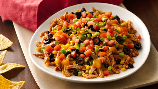 A favorite at parties, this crowd-pleasing layered dip is loaded with shredded pork, corn, black beans, guacamole, olives, sour cream, and of course melted cheese.