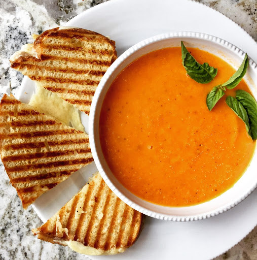 Remove from the oven, scoop tomatoes, onions (remove peels) and garlic (remove from skins), chicken stock and pan juices to a large pot or dutch oven and simmer for 10 minutes. Blend with an immersion blender (or transfer to a blender as an alternative) on high until completely smooth. Add salt and pepper to taste, top with julienned fresh basil.