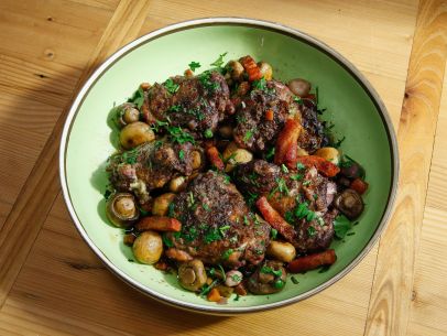 Add the pearl onions and drained vegetables and aromatics to the same pot and cook over medium heat until caramelized, 8 to 10 minutes. Add the reserved red wine mixture and cook until reduced by half, 10 to 15 minutes. Add the chicken stock and bring to a simmer. Season with salt and pepper. Return the chicken to the pot and cover.