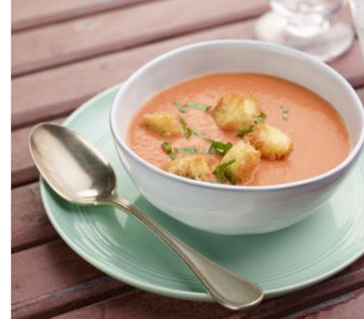 Add the cream to the soup and process it through a food mill into a bowl, discarding only the dry pulp that's left. Reheat the soup over low heat just until hot and serve with julienned basil leaves and/or croutons.