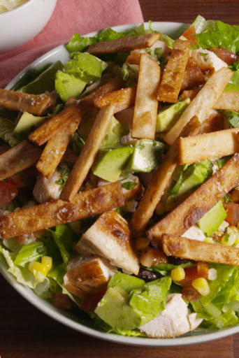 Assemble salad. Toss remaining ingredients in a large serving bowl. Top with cooked chicken and crispy tortilla strips then toss with dressing.
