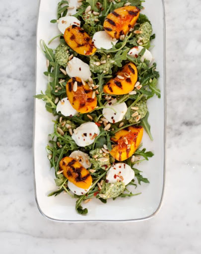 This awesome side dish features sweet grilled peaches, spicy arugula, creamy fresh mozzarella, crunchy pine nuts, and an herby mint pesto. Easy enough to prepare for a weeknights dinner but fancy enough to impress on special occasions.