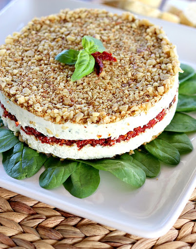 Place tomatoes on chopping board and chop into 1/4 " pieces and cover top of torte (I used at least half the 8 oz. Jar)