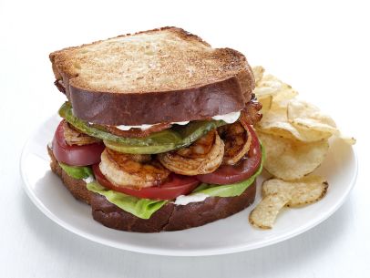 3. Lightly toast the potato bread and spread each slice with the sour cream mixture. Sandwich with the lettuce, tomatoes, shrimp, pickle slices and bacon. Serve with potato chips.