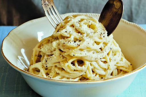 When the pasta is cooked, use a large strainer to remove it from the cooking water and quickly add it to the sauce in the bowl, keeping the cooking water boiling on the stove. Toss vigorously, adjusting with additional hot water a tablespoon or two at a time as necessary to melt the cheese and to obtain a juicy sauce that completely coats the pasta.