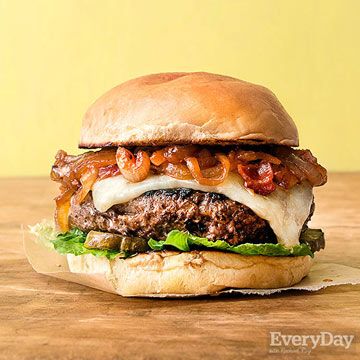 These burgers are always a huge home run hit! Spicy beef and pork burgers topped with white cheddar cheese and bacon barbecued onions sit on a bed of lettuce and pickles on kaiser rolls. Guess what were having for dinner? :)
