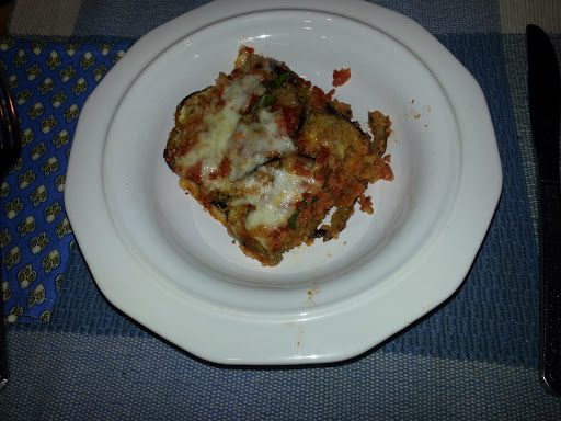 Stir basil into tomato sauce. Spread about 1/2 cup of the sauce in the bottom of the prepared baking dish. Arrange half of the eggplant slices over the sauce, overlapping slightly. Spoon 1 cup of the remaining sauce over the eggplant and sprinkle with half of the mozzarella cheese. Add a layer of the remaining eggplant slices and top with the remaining sauce, mozzarella and Parmesan. Bake, uncovered, until the sauce bubbles and the top is golden, 15 to 20 minutes.
