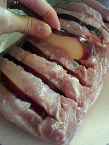 Cut slits in the pork loin (approx 1/2″-3/4″).