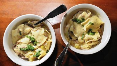 Reduce the heat, and add the meat and gravy. Then add the noodles, a couple at a time, stirring so they don't stick. Turn down heat to a gentle simmer (just under a boil). Cook about two hours till the noodles are very soft.