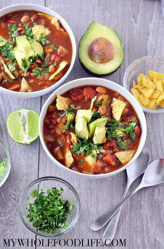 Place all the ingredients in a slow cooker , except the tortilla chips, and cook on high for about 3-4 hours. Once done, you can add the tortilla chips or strips and choose whatever garnish options you like. Enjoy!