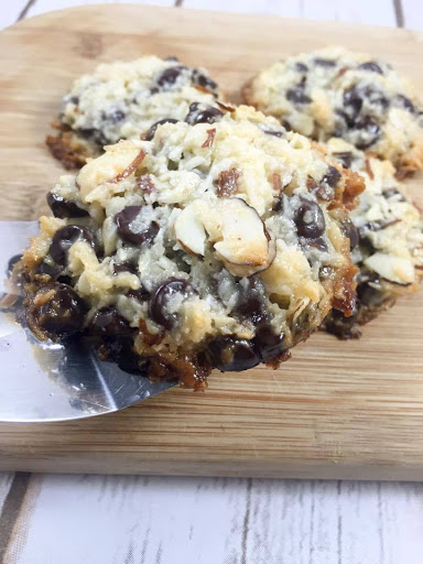 Mix unsweetened coconut, almonds, and chocolate chips. Add Sweetened Condensed Milk to coconut mixture and stir until combined.