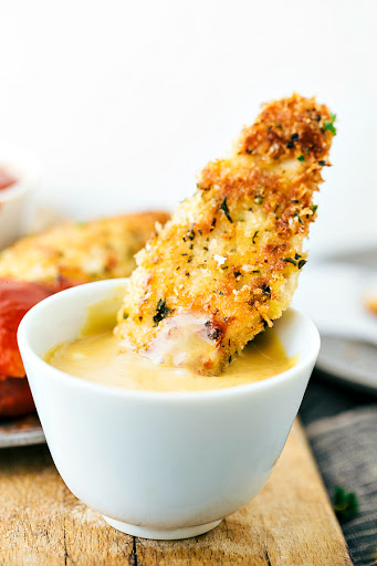 Place the tenders in the flour mixture, then the garlic oil, then the panko mixture making sure to evenly and thoroughly coat each piece.