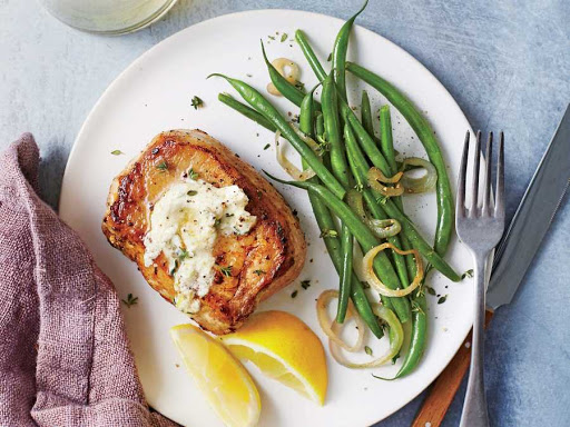 Pork Chops with Herbed Goat Cheese Butter & Green Beans