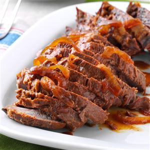 3. Remove meat to a cutting board. Let stand for 10 minutes. Thinly slice meat and return to the slow cooker; serve with cooking juices and onion. Yield: 10 servings.