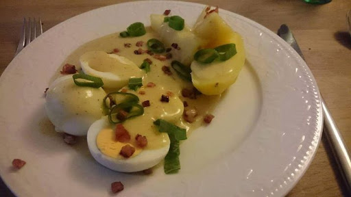 Serve the sauce over halved eggs and sprinkled with parsley.