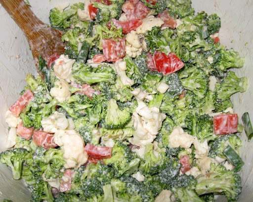 Blanch the broccoli and cauliflower and then chop add everything in a large bowl add the dressing and toss. Place in the frig for four (4) hours and serve.