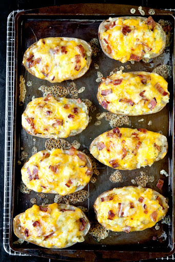 Halve potatoes lengthwise and scoop out insides with a spoon into a medium bowl, leaving 1⁄4" of the outer layer of flesh and skin behind; transfer empty potato halves to a baking sheet. Combine scooped potato insides, 1⁄2 cup each cheddar and Gruyere, and sour cream, butter, chives, parsley, Tabasco, Worcestershire, and bacon and season with salt and pepper. Spoon mixture into potato halves and sprinkle with remaining cheese and paprika.