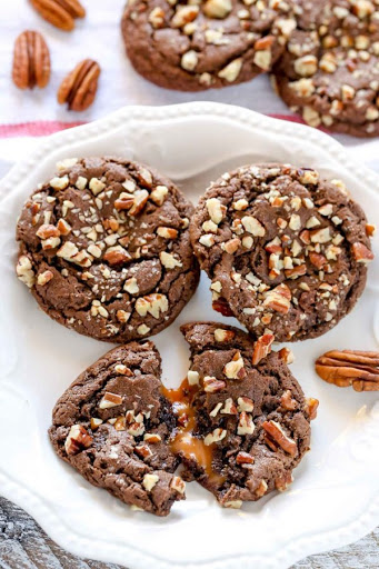 Remove the cookie dough from the refrigerator. Using a cookie scoop or spoon, measure out two tablespoon sized pieces of cookie dough onto the prepared baking sheets. Flatten each piece of cookie dough, place half of a soft caramel candy in the center, then wrap the dough back around the caramel, and roll the dough into a ball. Roll the top and sides of each ball of cookie dough into the chopped pecans.
