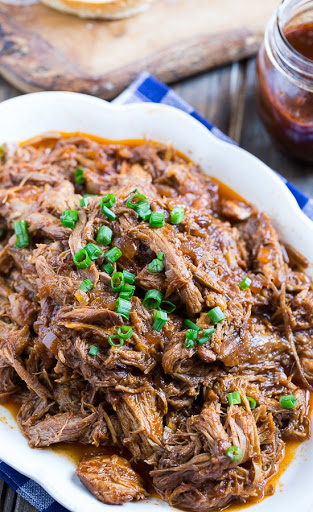 Drain the remaining juices and toss the meat and onion mixture in the barbecue sauce of choice. I don't have an exact amount listed-just add a bit at a time until you get to your desired sauciness!