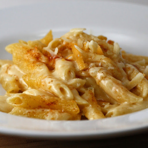 Combine cooked pasta and Flagship Sauce in a medium bowl and mix carefully but thoroughly. Scrape the pasta into a prepared baking dish. Sprinkle the top with the cheeses, then the chile powder. Bake uncovered for 20 to 30 minutes, until the top has a nice golden crust. Let sit for a few minutes before serving.