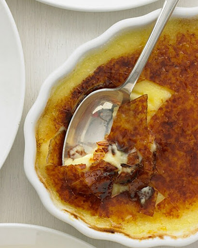 Caramelize tops and serve: Sprinkle about 1 1/2 tablespoons granulated sugar over each custard. Working with one at a time, pass the flame of the torch in a circular motion 1 to 2 inches above the surface of each custard until the sugar bubbles, turns amber, and forms a smooth surface. Serve immediately.