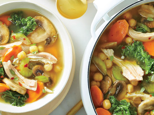 This easy soup is full of immunity-boosting foods: vitamin C–rich kale, vitamin D–enhanced mushrooms, zinc-containing chicken and chickpeas, and antioxidant-packed garlic. Plus, the hot, steamy broth and a hint of pepper heat get your nose running—great for flushing out sinuses and potentially staving off an infection. It’s a big pot of brothy soup that you can make ahead and enjoy for a couple of days; the flavor just gets better over time. You may be wary of the large amount of garlic, but keep in mind that it mellows considerably after being cooked. Though we love using bone-in chicken breasts here, you can also swap in 3 cups shredded rotisserie chicken breast in a pinch (be aware that it will add more sodium)."