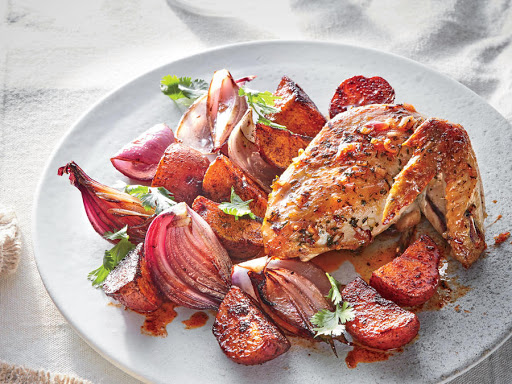 A whole chicken, cut into quarters, lets everyone enjoy their favorite parts of the bird. You can quarter the chicken yourself by removing each breast first, then the thigh and leg pieces. You can also ask your butcher to do this, or purchase leg quarters and bone-in breasts. The skin will help to insulate the meat and lock in the chimichurri flavor as it roasts in the hot oven. It’s easiest to remove the skin and replace it after rubbing the herb mixture over the chicken. A quick broil after roasting gets the potatoes nice and crisp.